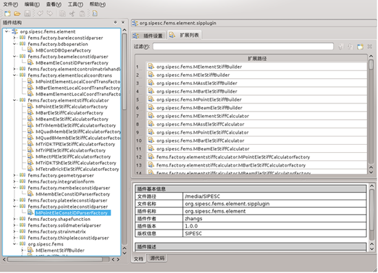 插件式体系结构的独特优势在于可按组件方式灵活构建应用软件系统,组件式结构是软件的系统构架模式之一。插件式体系结构是将软件系统的功能分解成不同的插件,插件是可独立于系统进行单独开发,可将这些插件使用简便的加载方法组装成一个软件系统,并且插件可以被自由地加载、卸载。SiPESC为用户提供了管理各类插件的工具,插件管理器界面如下: