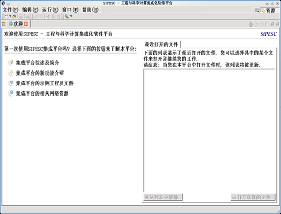 插件的接口采用xml进行描述,因此该平台系统的插件接口是自由开放的,由于插件开发者来定义接口,基于接口进行扩展,并提供给其它插件使用。因此系统可以满足各种不同的需求,只要安装相应的插件即可。SiPESC.IDE软件系统主界面如下图: